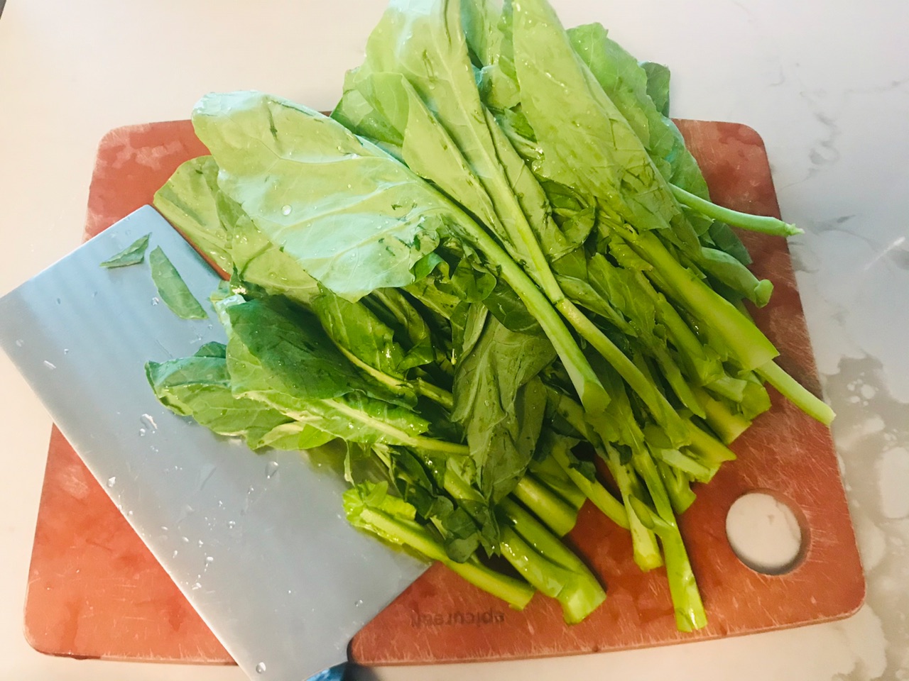 步骤6、等到饭快焖好的时候,可以开始准备配菜了。这里我用了一些芥蓝,粗略切一下,用开水焯煮两分钟,变软即可取出。