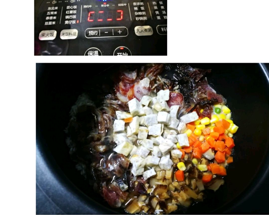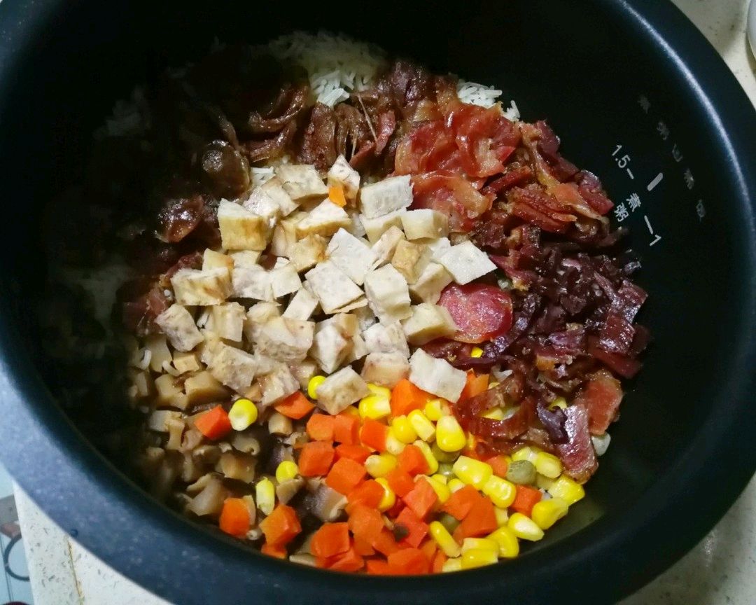 步骤3、加入电饭煲平时煲饭的水量,上面平铺好全部配菜,选择煲仔饭模式开启。