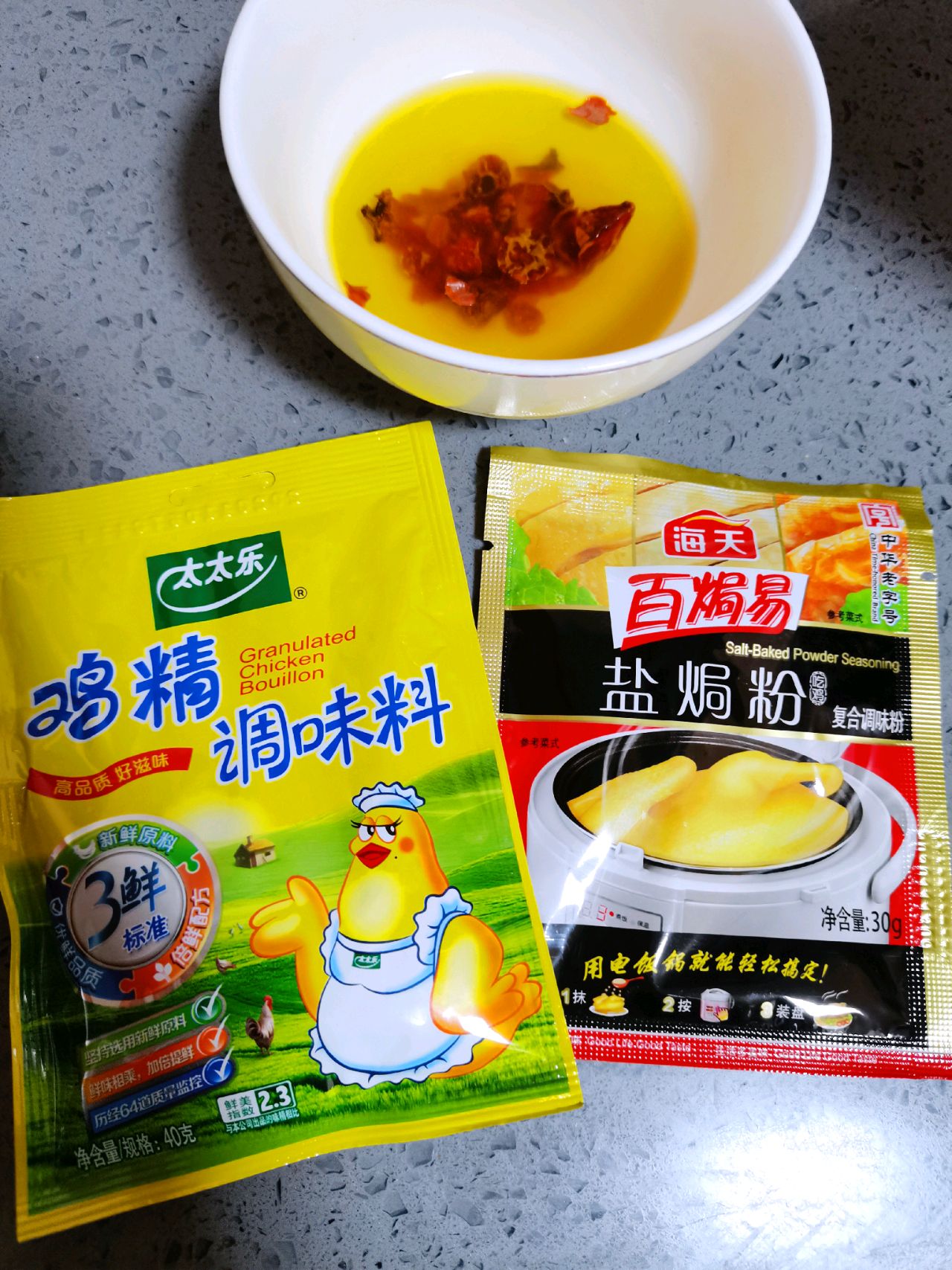 步骤2、用开水将黄栀子泡出颜色,鸡精、盐焗粉调料备用