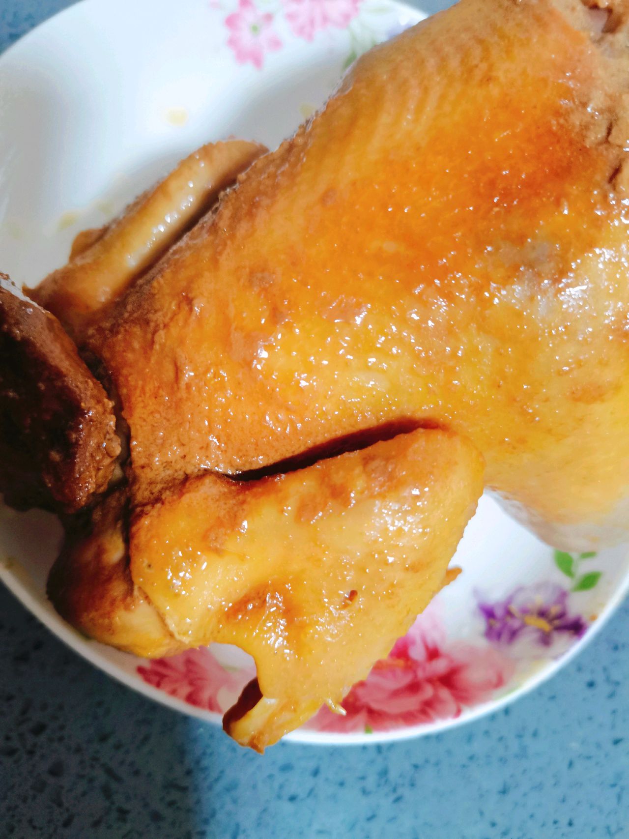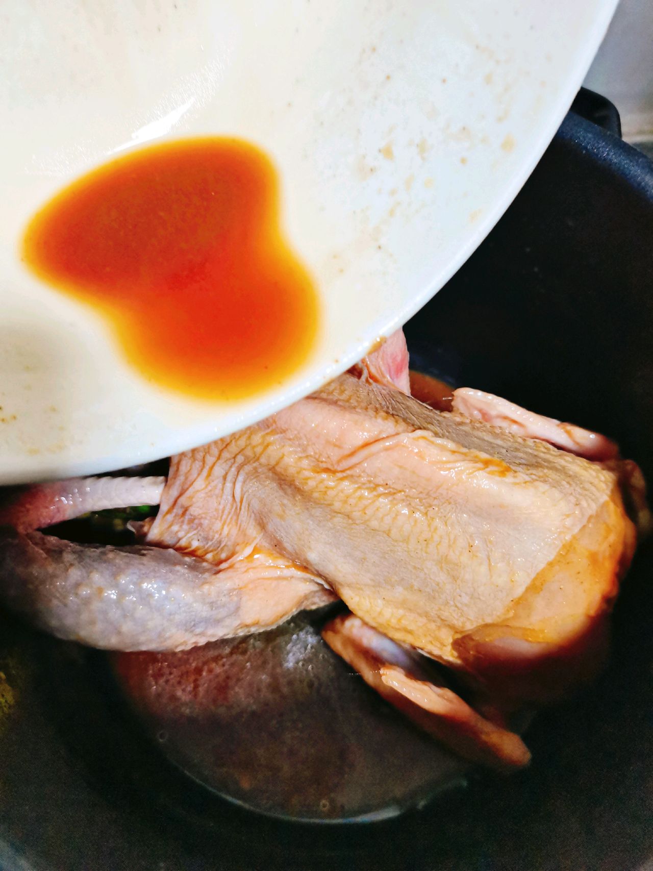 步骤5、将整鸡放入高压电饭锅,倒入酱汁