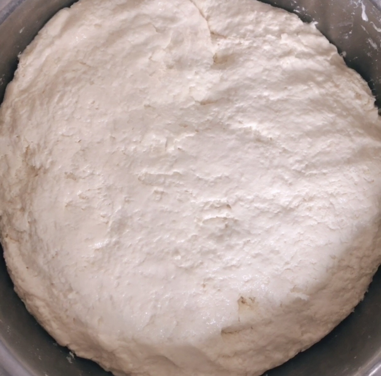 步骤18、和面要用温水,活成面团,不要太干,最后面团上面再拍一点温水,盖上盖子,放在暖和的地方,发4个小时左右