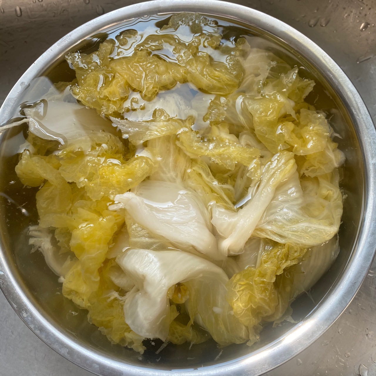 步骤1、看了许多菜谱都说只要把酸菜水冲一下就行,以免酸味流失,我曾经也是这样的,但发现做出来的味道不是我想要的。于是,我采用了不一样的做法,把酸菜尽量多洗去酸味。