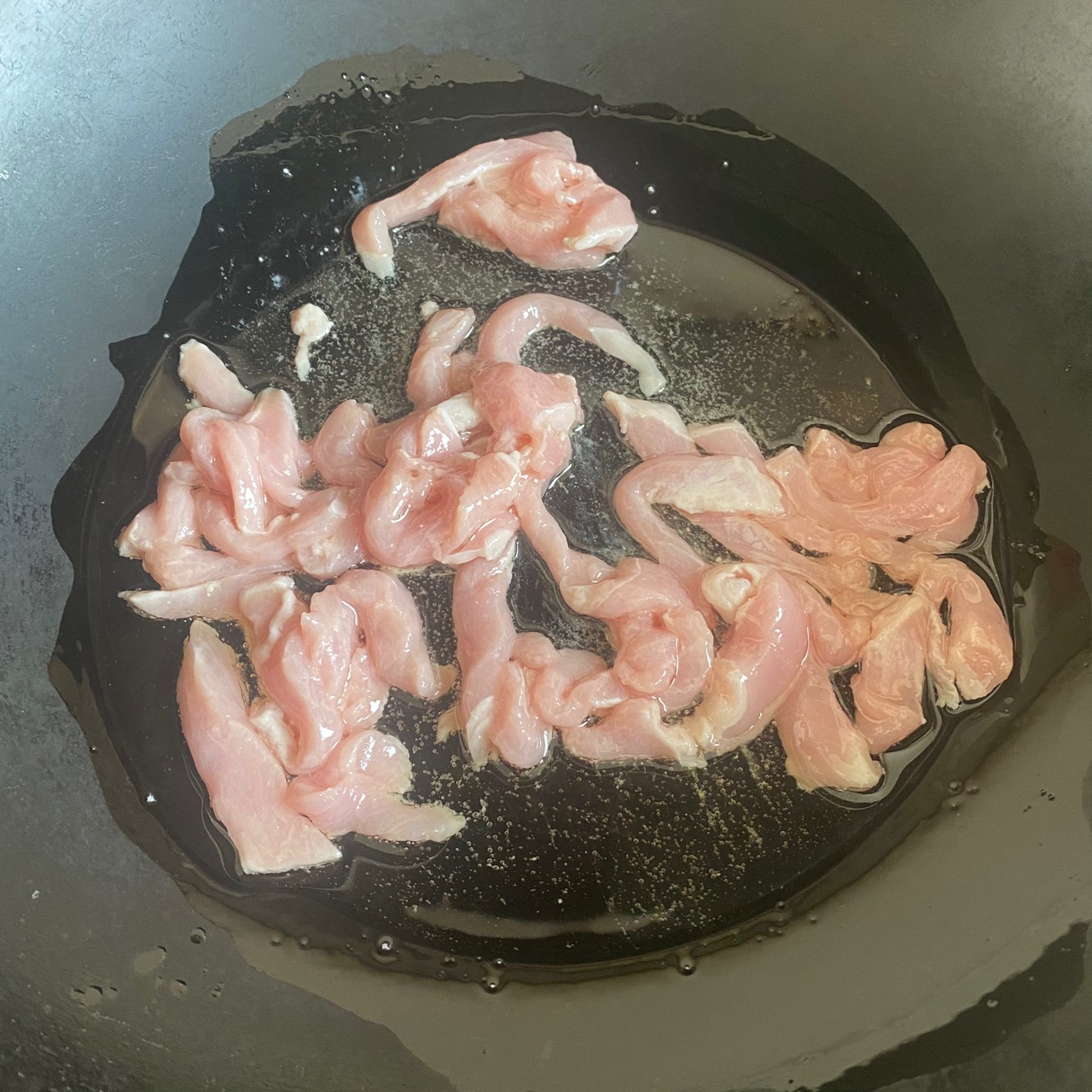 步骤6、凉油肉丝下锅滑开,放入葱姜蒜煸出香味