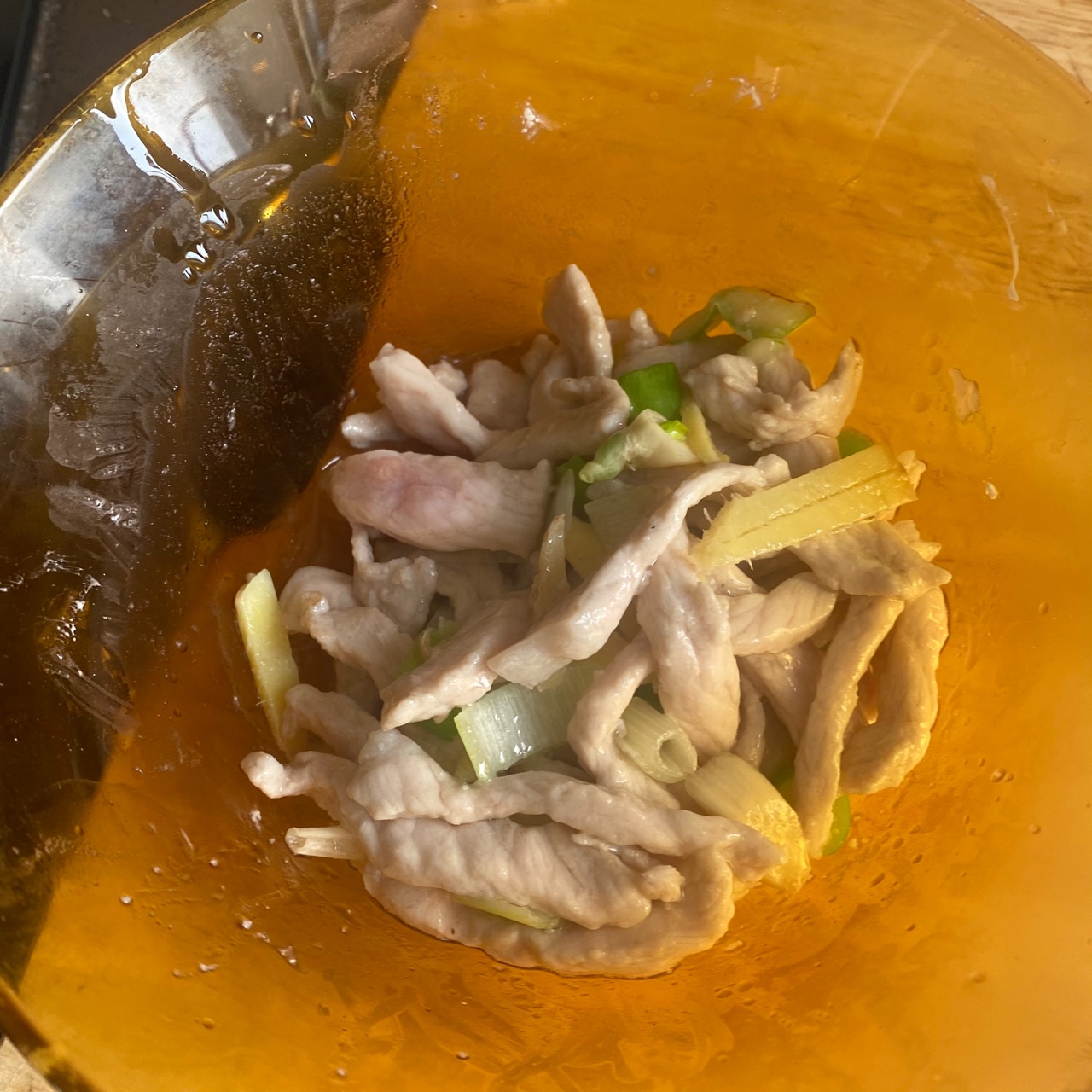 辅料:大蒜适量、生姜适量、盐1小勺、葱花适量、生抽1勺、香油适量、里脊50克、小米辣1个