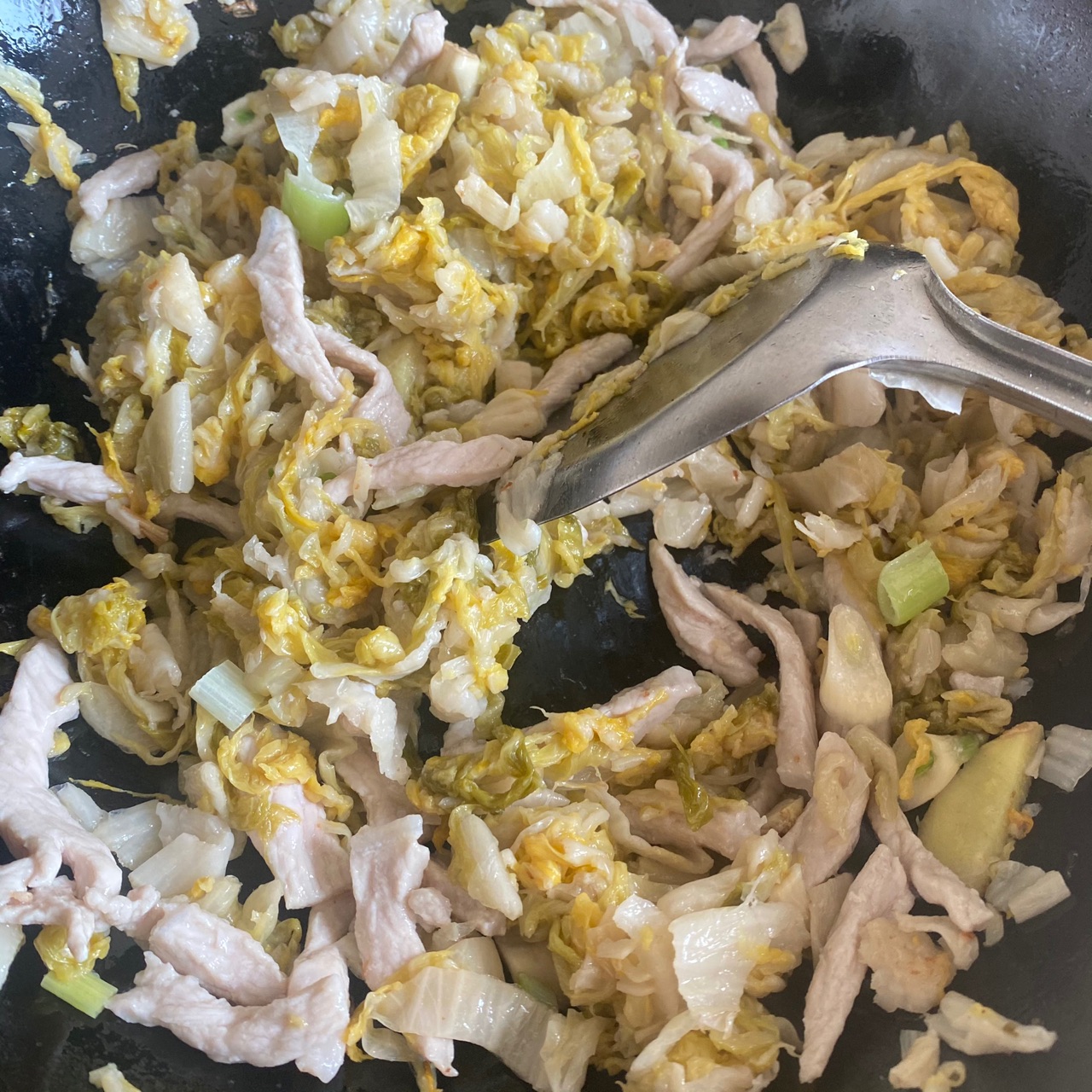 步骤8、锅里底油留下,酸菜丝下锅炒散
