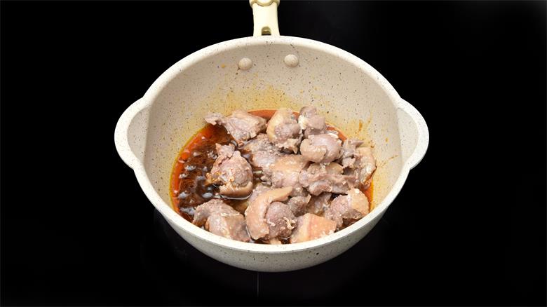 步骤5、锅内热油,放入鸭块滑炒至变色盛出备用。