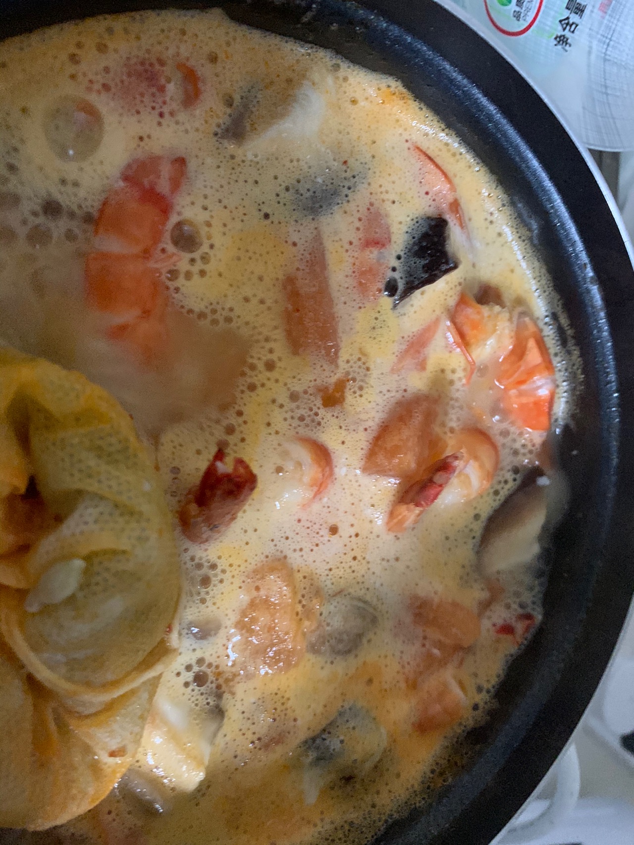 步骤3、在锅中倒入960ml矿泉水,将刚炒好的虾头放入一半,放入调料包,加入切好的西红柿,冬阴功酱煮5分钟,加入虾,蛤蜊,草菇。自己爱吃的食材都可以加。煮15分钟,倒入椰浆。将柠檬汁适量挤入。
