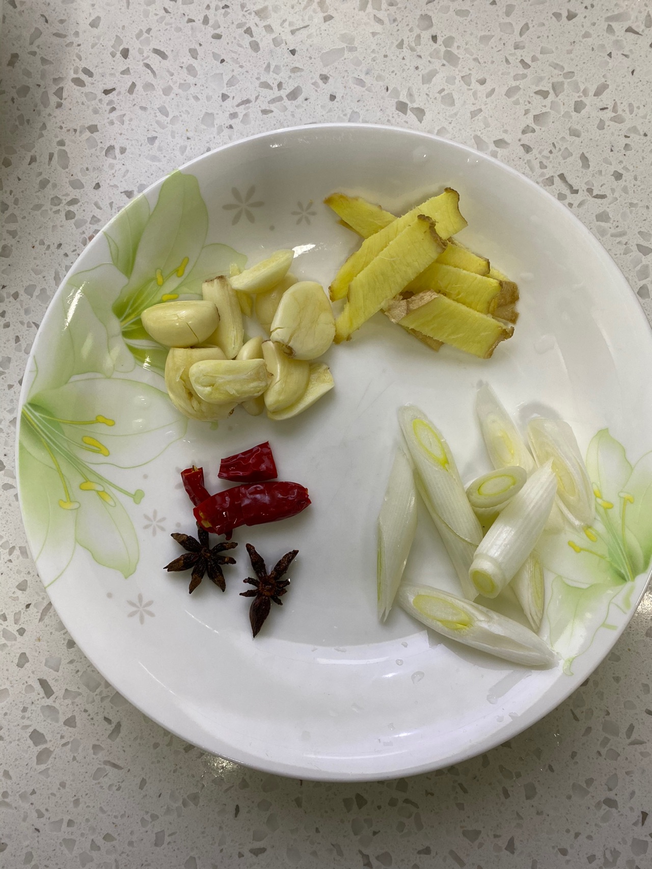 步骤5、另起一锅,锅中放油小火煸炒五花肉,待两面微焦,放葱椒蒜干辣椒八角,继续翻炒