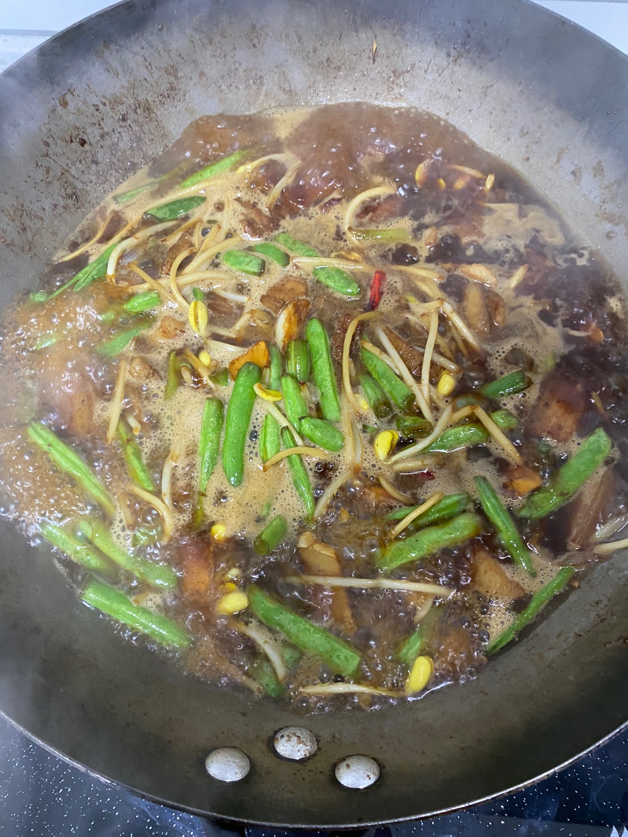 步骤6、放料酒、生抽、老抽、十三香,翻炒一会儿放豆角、黄豆芽