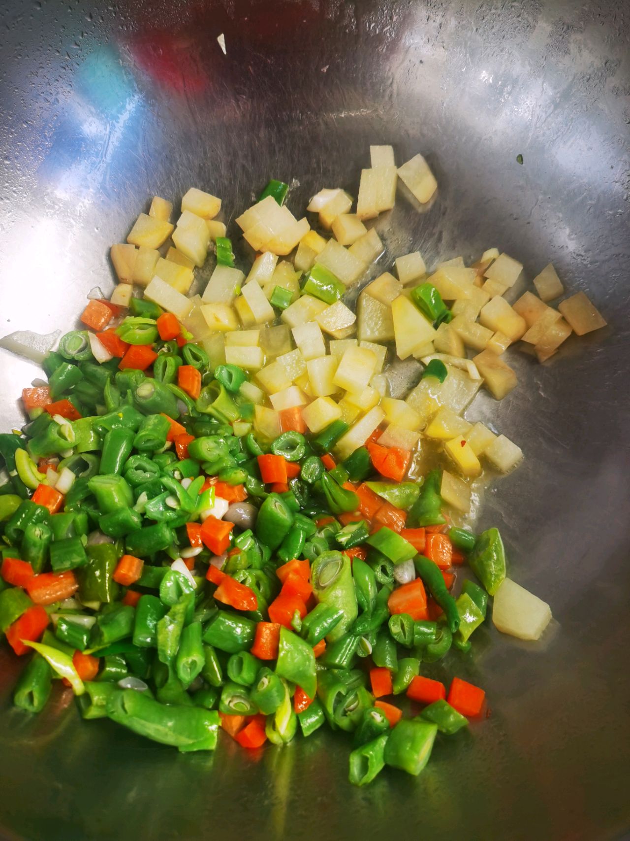 步骤1、把豆角,土豆,胡萝卜切丁。准备葱末。
