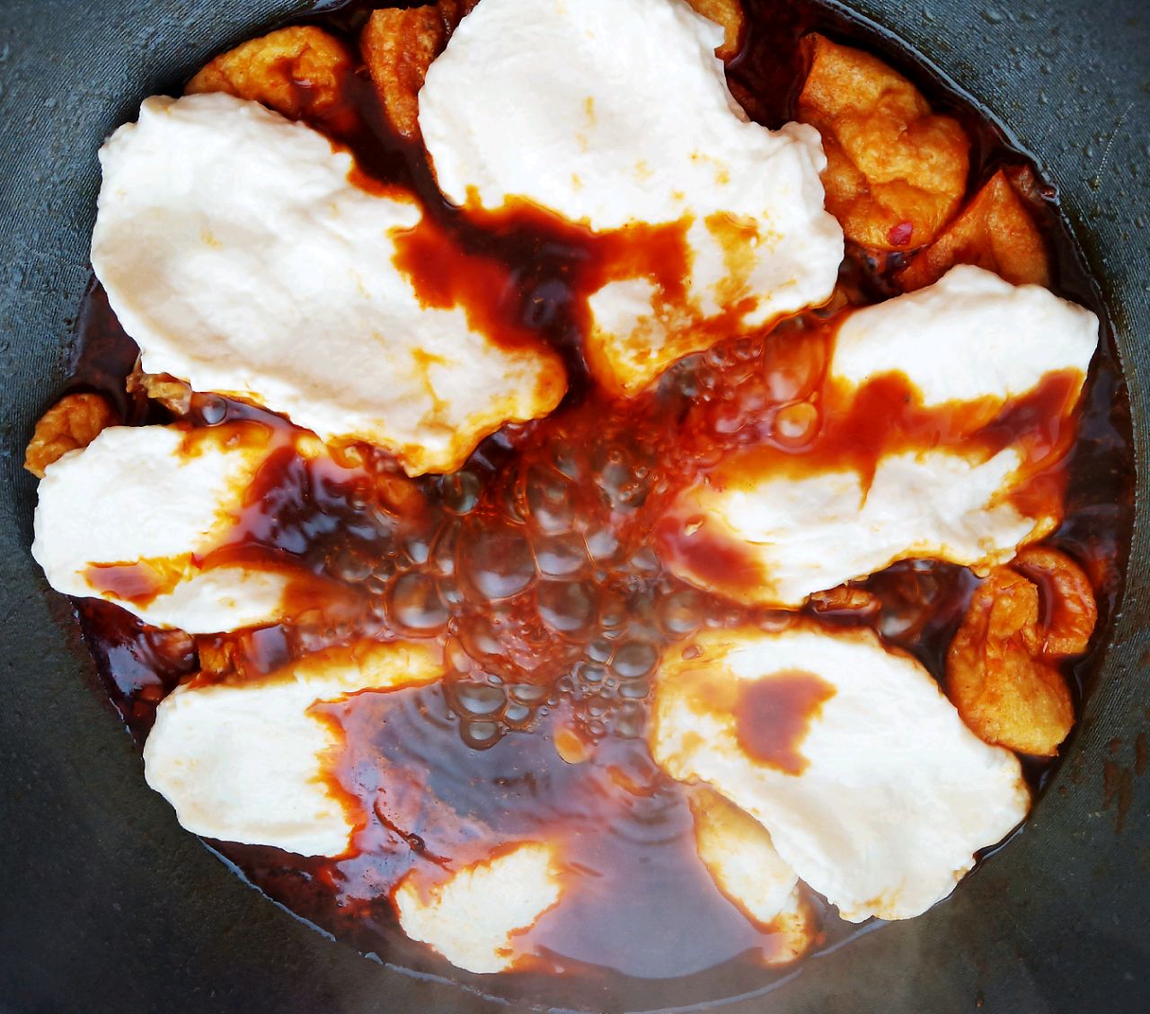 因为豆瓣酱和酱油都有咸味,所以整个过程中就不要再加盐了。豆泡可以切一下,这样更入味,直接去炖也是可以的。
