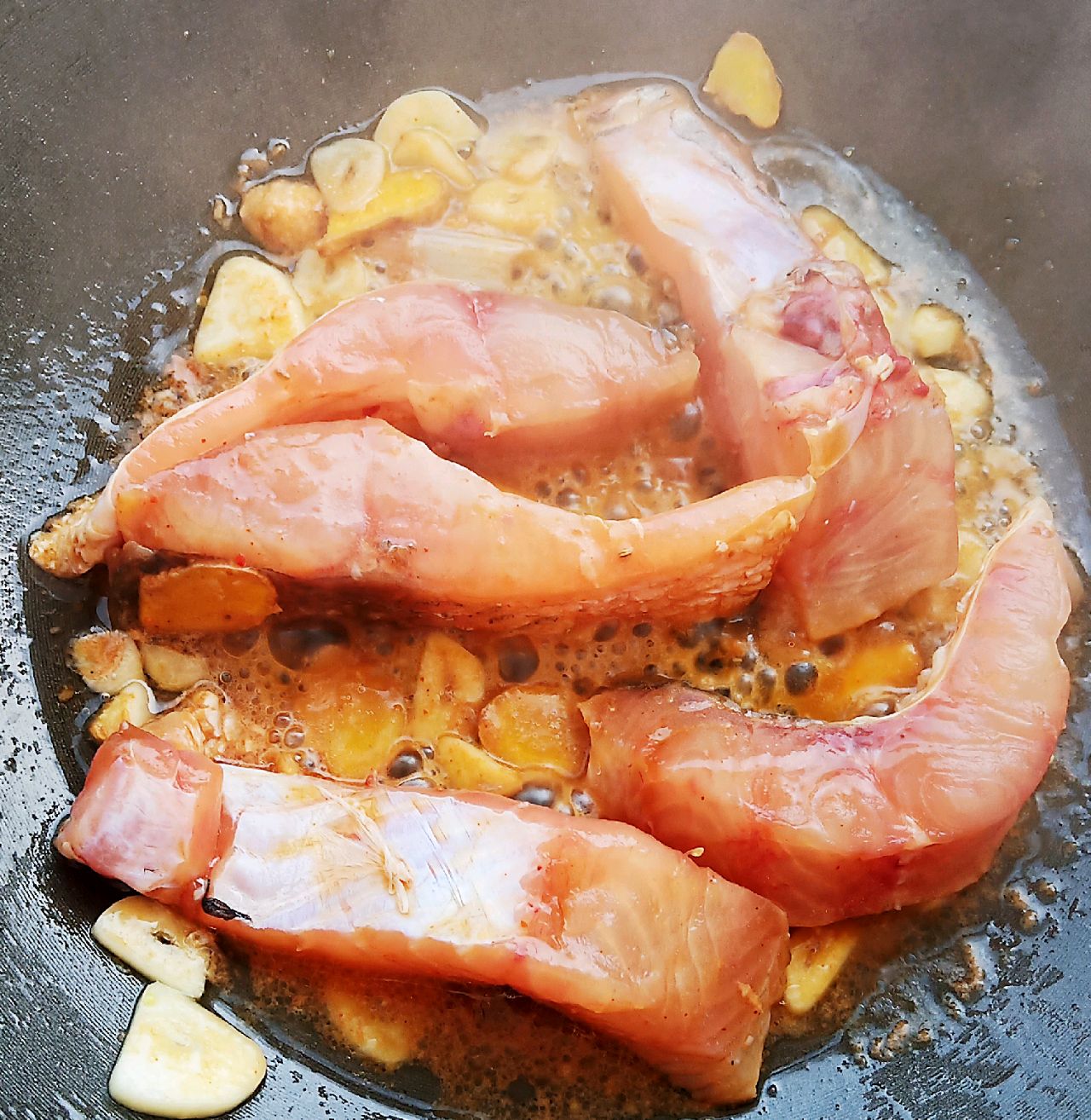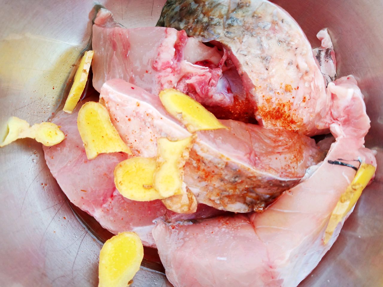 步骤4、草鱼块加入一勺料酒,适量五香粉腌制一下。