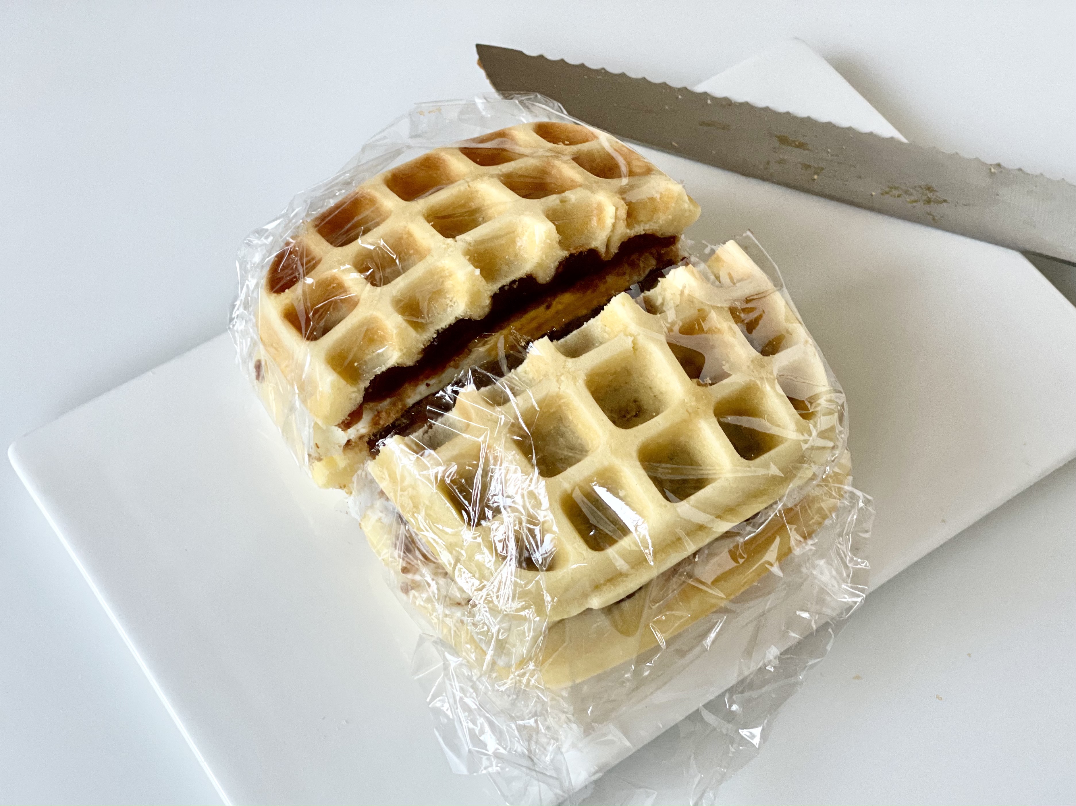 步骤14、然后把两片华夫饼合起来,压紧,用保鲜膜裹上有助于定型。