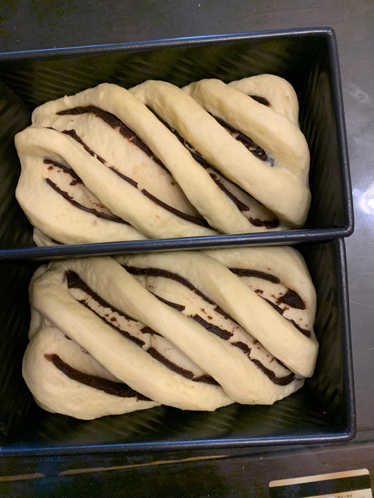 步骤15、放入吐司盒中进行二次发酵。烤箱里放碗热水增加湿度。