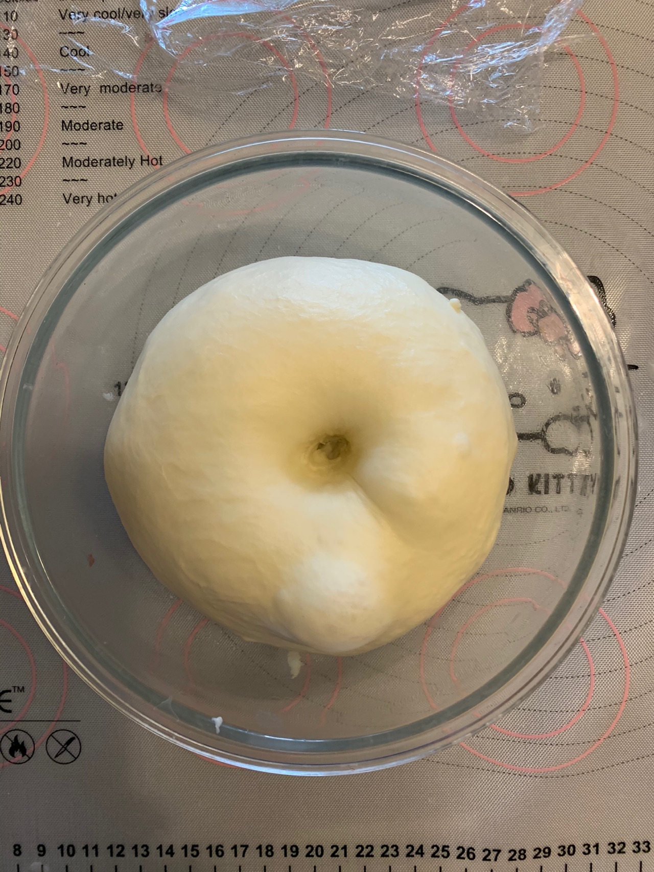 步骤5、发酵至2倍大,室温大约1小时。手指戳个洞不回缩不塌陷发酵完成。