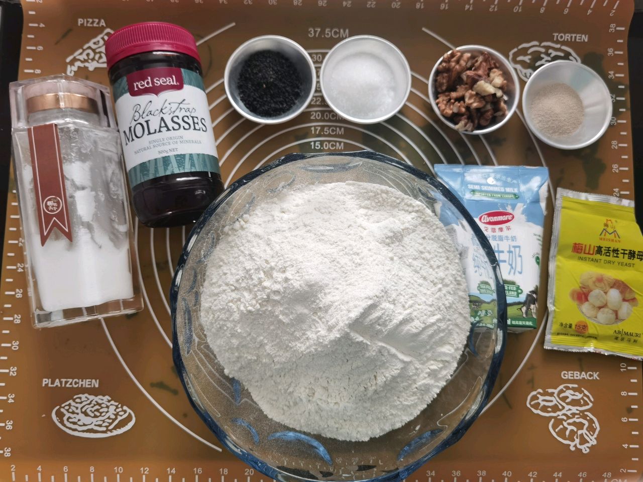 辅料:椰子油50g、黑糖液适量、中筋面粉适量、干酵母2g、低脂纯牛奶200ml、白糖10g