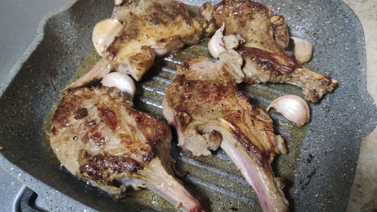 步骤4、中途加入若干大蒜头,大蒜头不要去皮,但要洗净的,摇晃煎锅,让羊排受热均匀,两面要继续撒点孜然粉