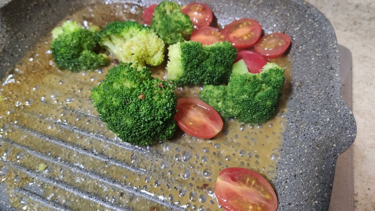 步骤6、利用煎锅内的黄油和煎出来的羊油煎圣女果和焯过水的西蓝花,量不要多,少量即可