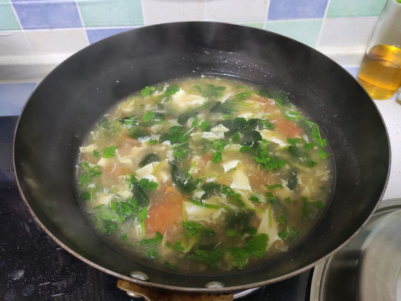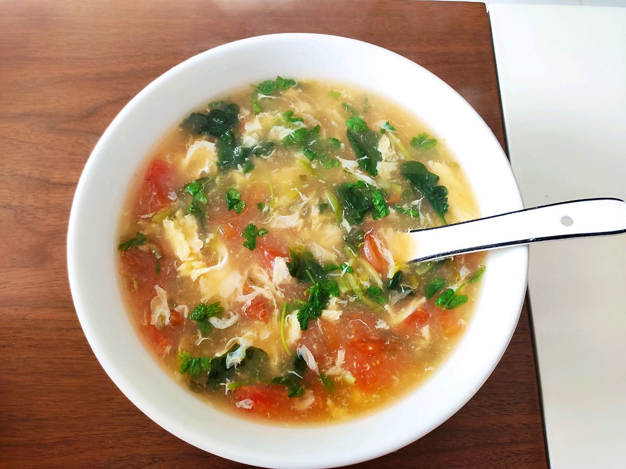 辅料:淀粉3勺、盐1勺、番茄1个、葱1根、蒜4瓣、油1汤匙、鸡精1勺、白胡椒适量、香油适量、香菜适量