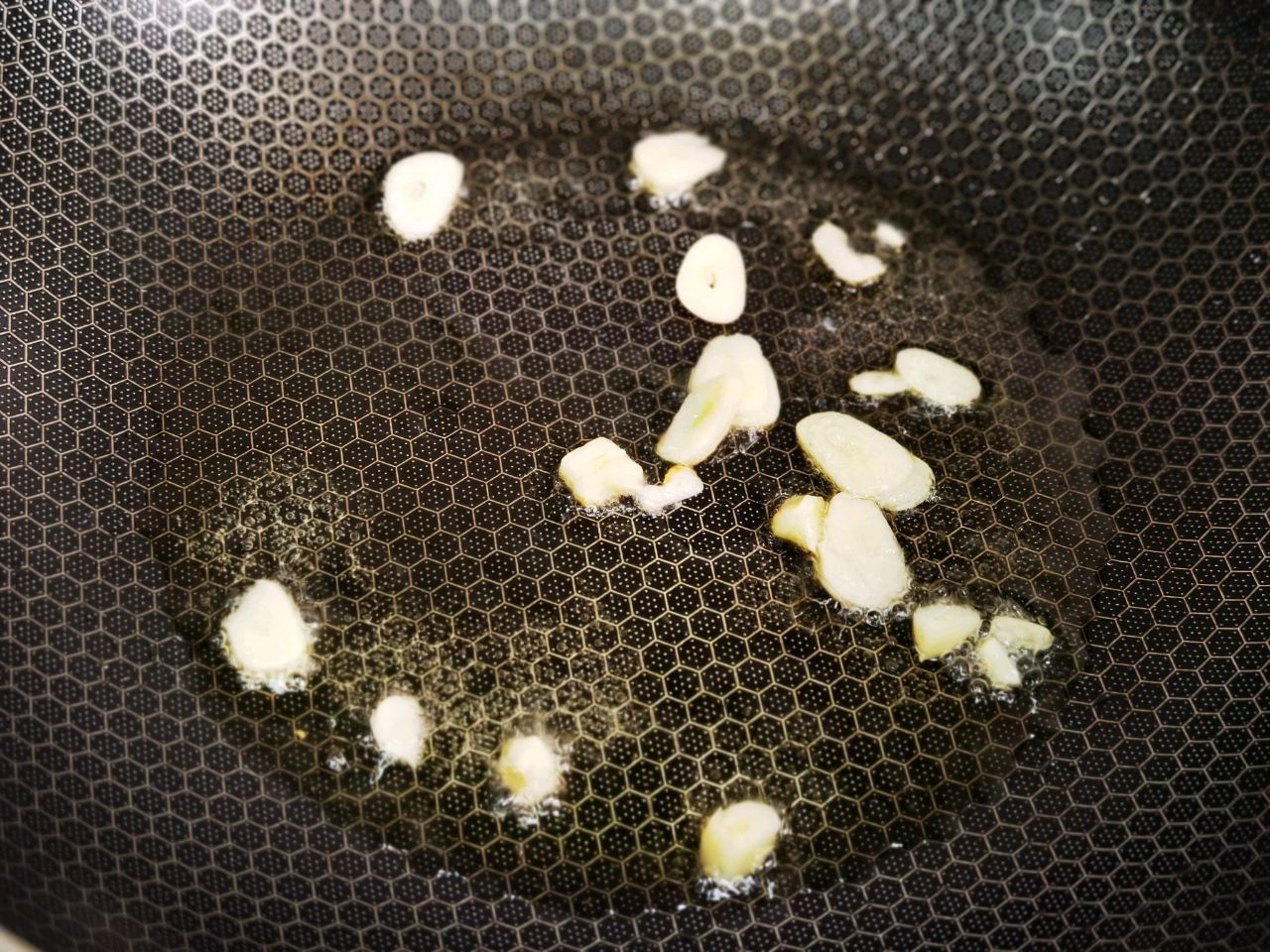 步骤2、锅烧热,倒入橄榄油和蒜瓣爆香