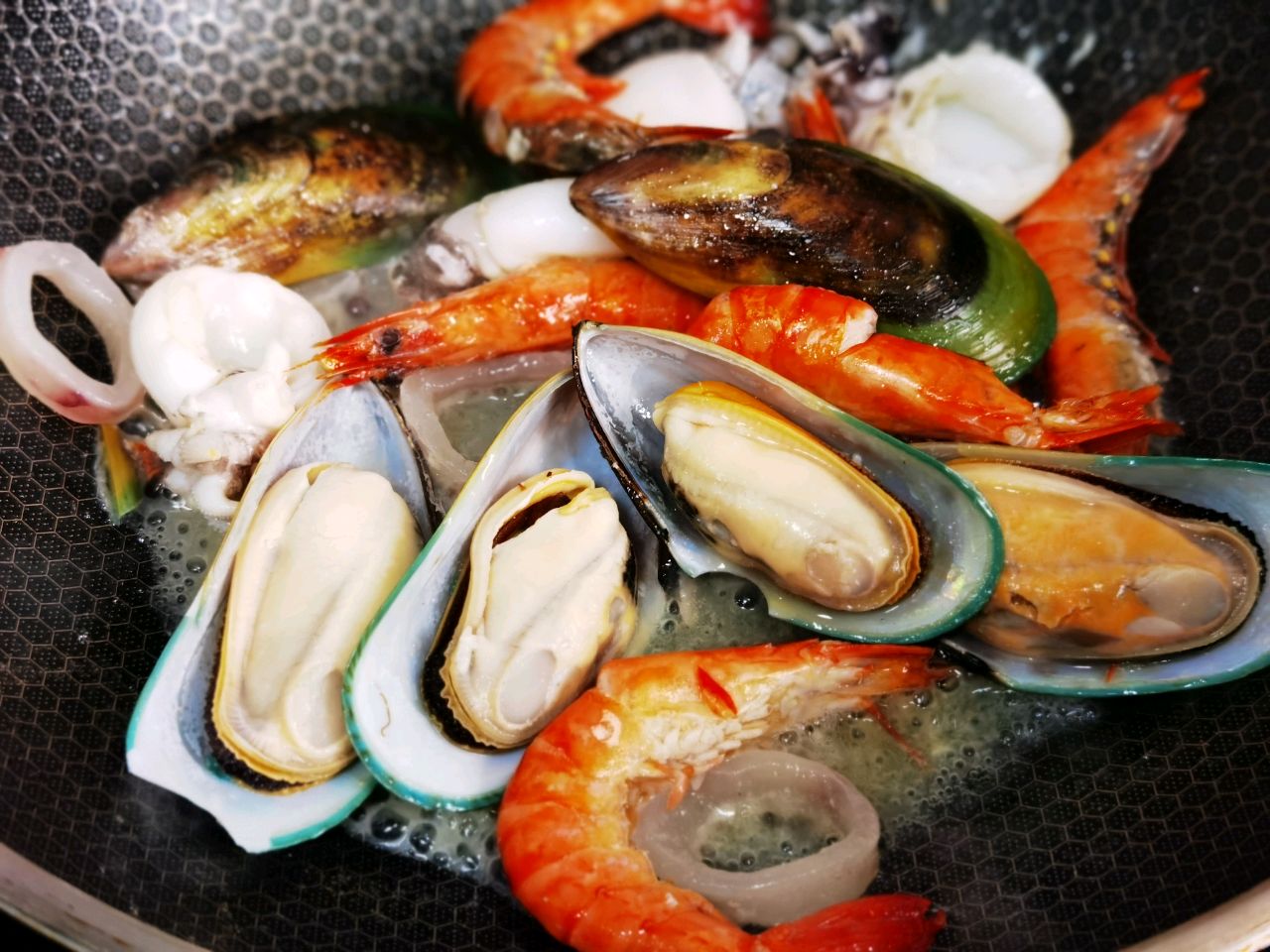 步骤3、倒入海鲜类的材料,炒到变色后加一勺白兰地去腥