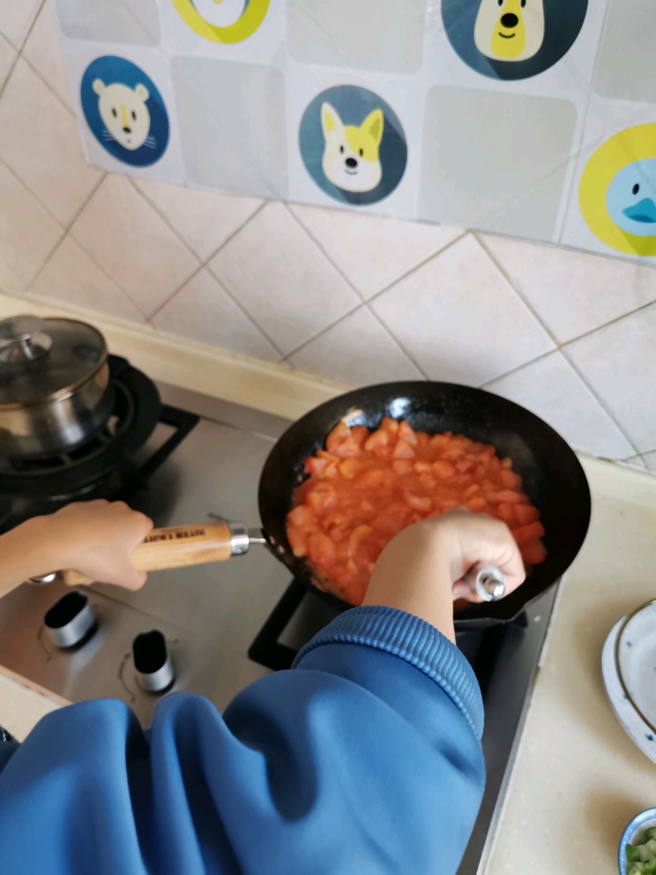 步骤10、左手扶住锅把,右手拿锅铲慢慢翻炒,然后一边按压一边把番茄切烂。大概两三分钟后番茄汁就出来了,番茄会变得又软又烂。