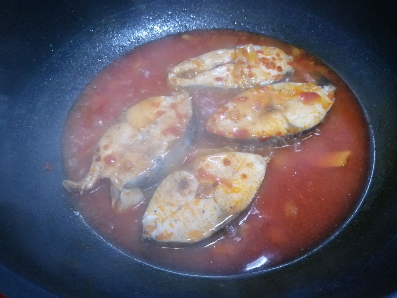 步骤4、放入鲅鱼段煎至一面金黄,再翻面