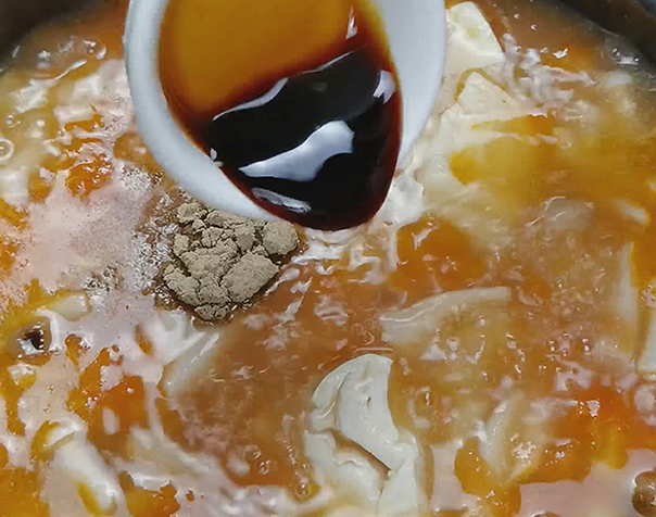 步骤9、煮开后把蟹味菇、海鲜菇和豆腐放进去,盖盖小火煮二十分钟。