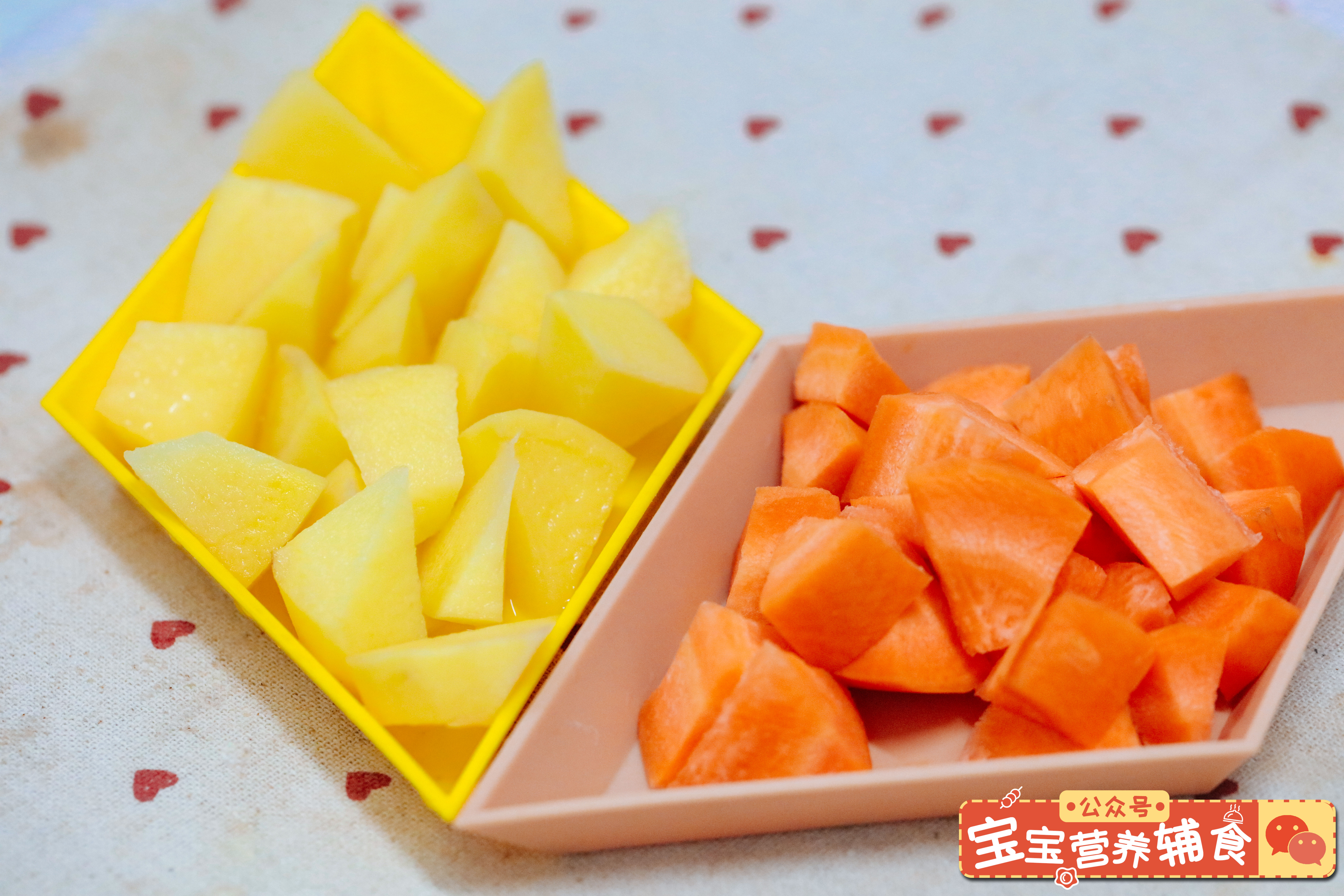 步骤2、土豆和胡萝卜去皮,切成小滚刀块。tips:有姐妹们不会的吗?不用太刻意切成滚刀块,只要切成块就行了。