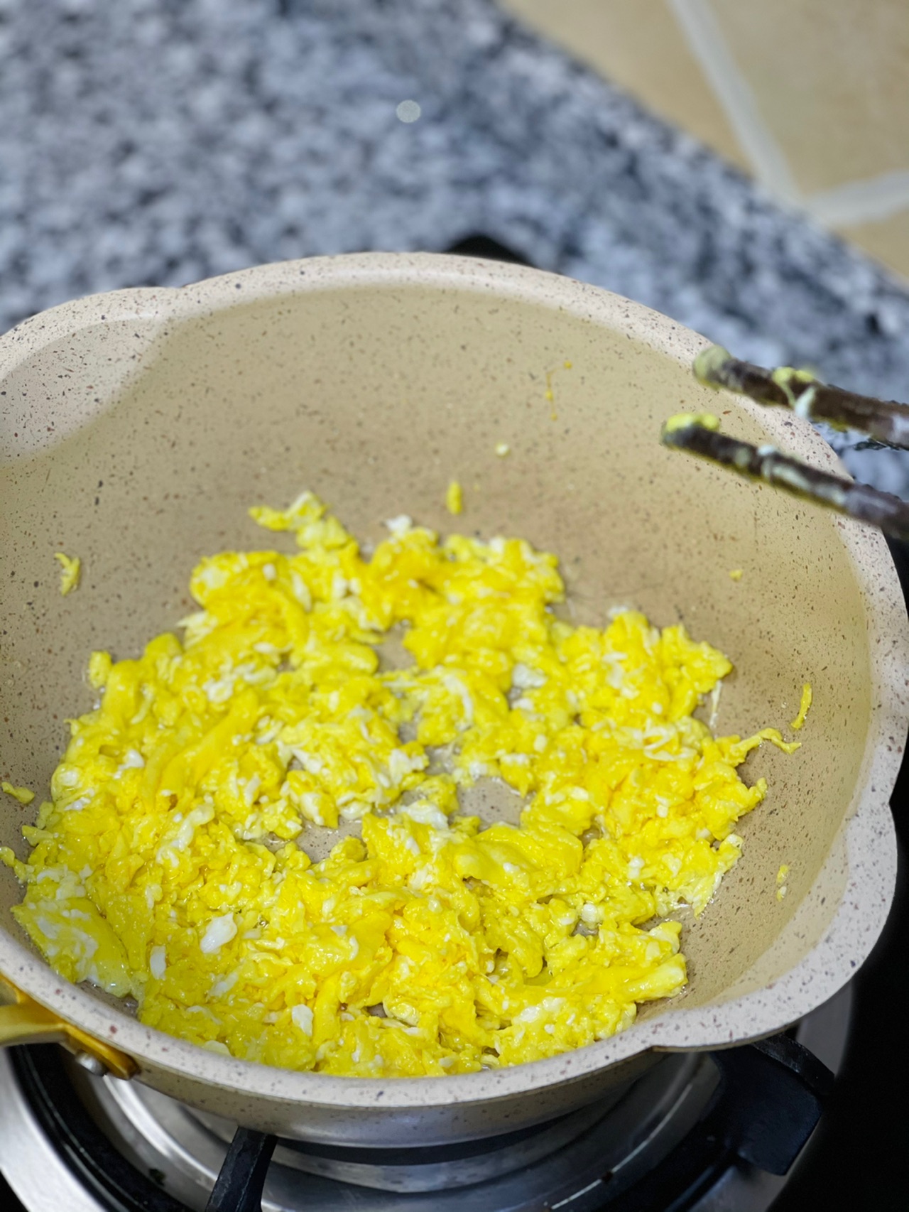 步骤7、锅里加油、鸡蛋用筷子搅碎,放凉备用