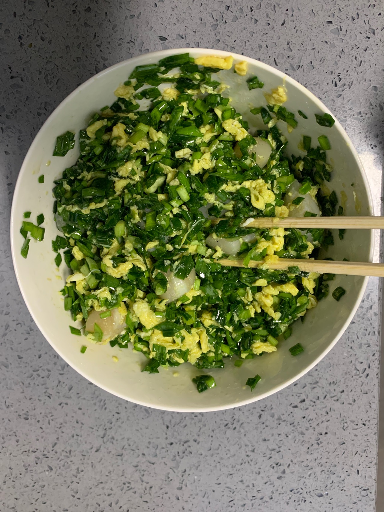 辅料:水200克、绿色面团部分、面粉400克、菠菜100、水200克、馅料部分、韭菜1把、扇贝70个、鸡蛋4个、盐适量、油适量、香油1小勺
