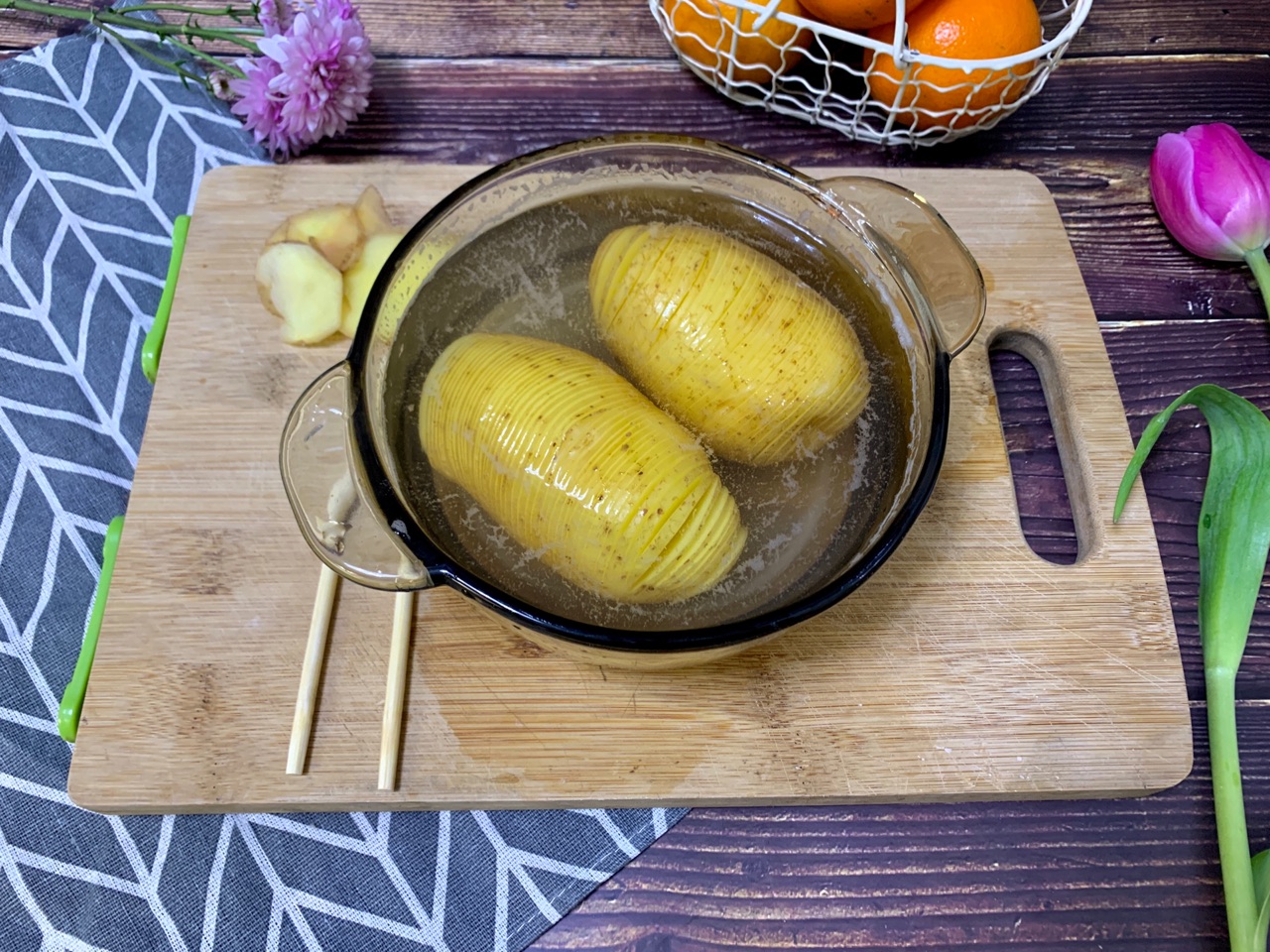 步骤7、土豆从盐水中捞出,擦干水分,土豆用硅胶刷刷上黄油,每片中间都要涂抹到哦