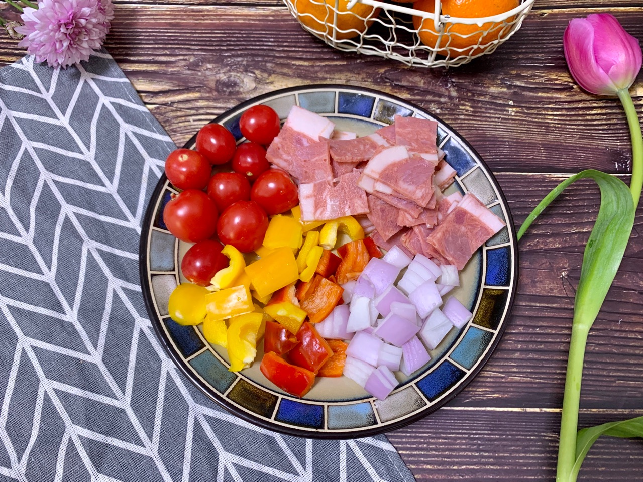 辅料:培根5-6片、黑胡椒少许、蜂蜜30g、蚝油30g、黄油20g、小番茄、洋葱适量、黄椒、红椒适量、马苏里拉芝士适量