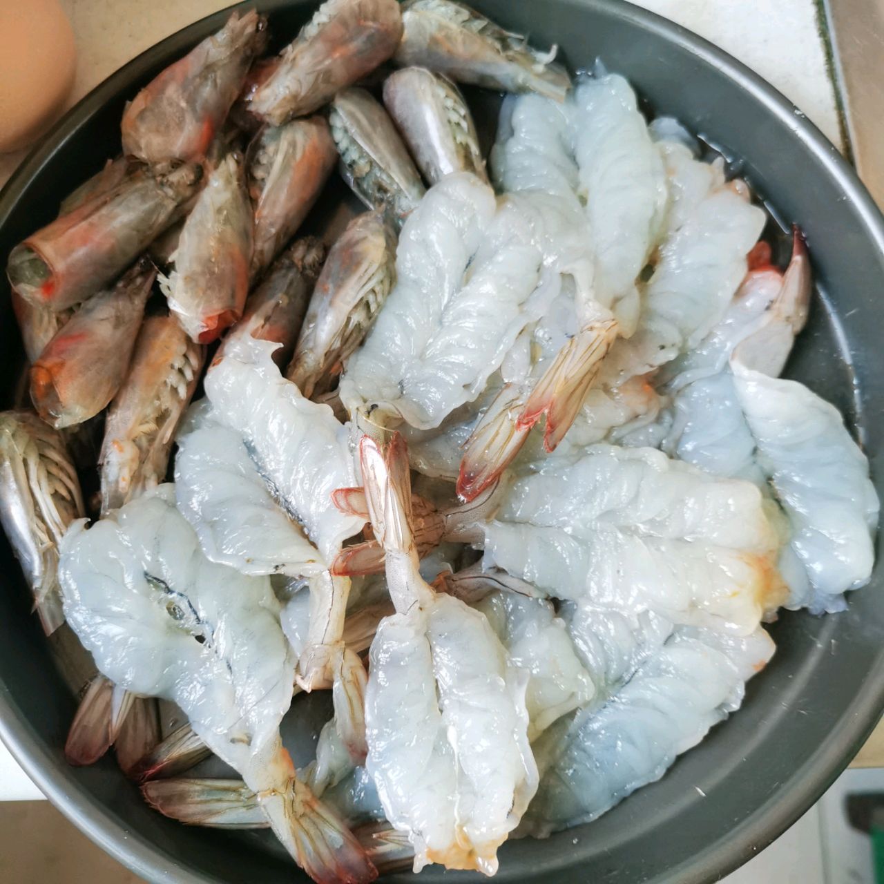 步骤1、虾揪掉虾头(虾头不要扔,可以炖豆腐很鲜),去除虾壳只留尾部,从背部划开不要划断,取出虾线,用刀背拍散,用盐料酒生姜丝腌制除腥