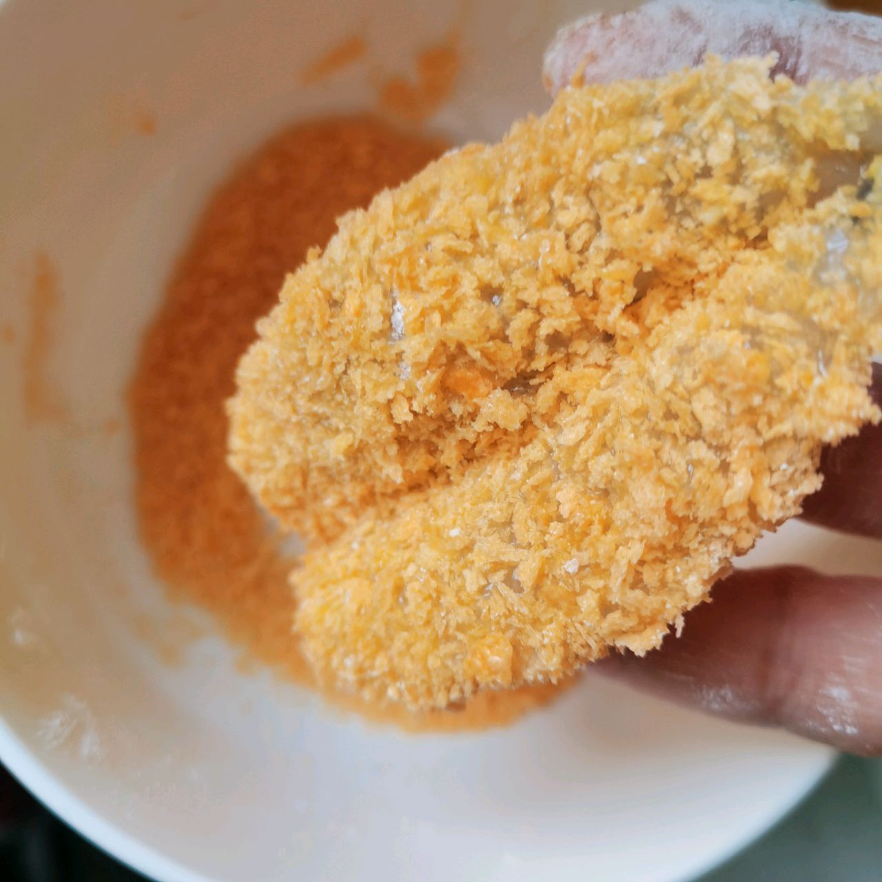 步骤4、再裹层蛋液,放面包糠滚一圈,空气炸锅180℃预热5分钟