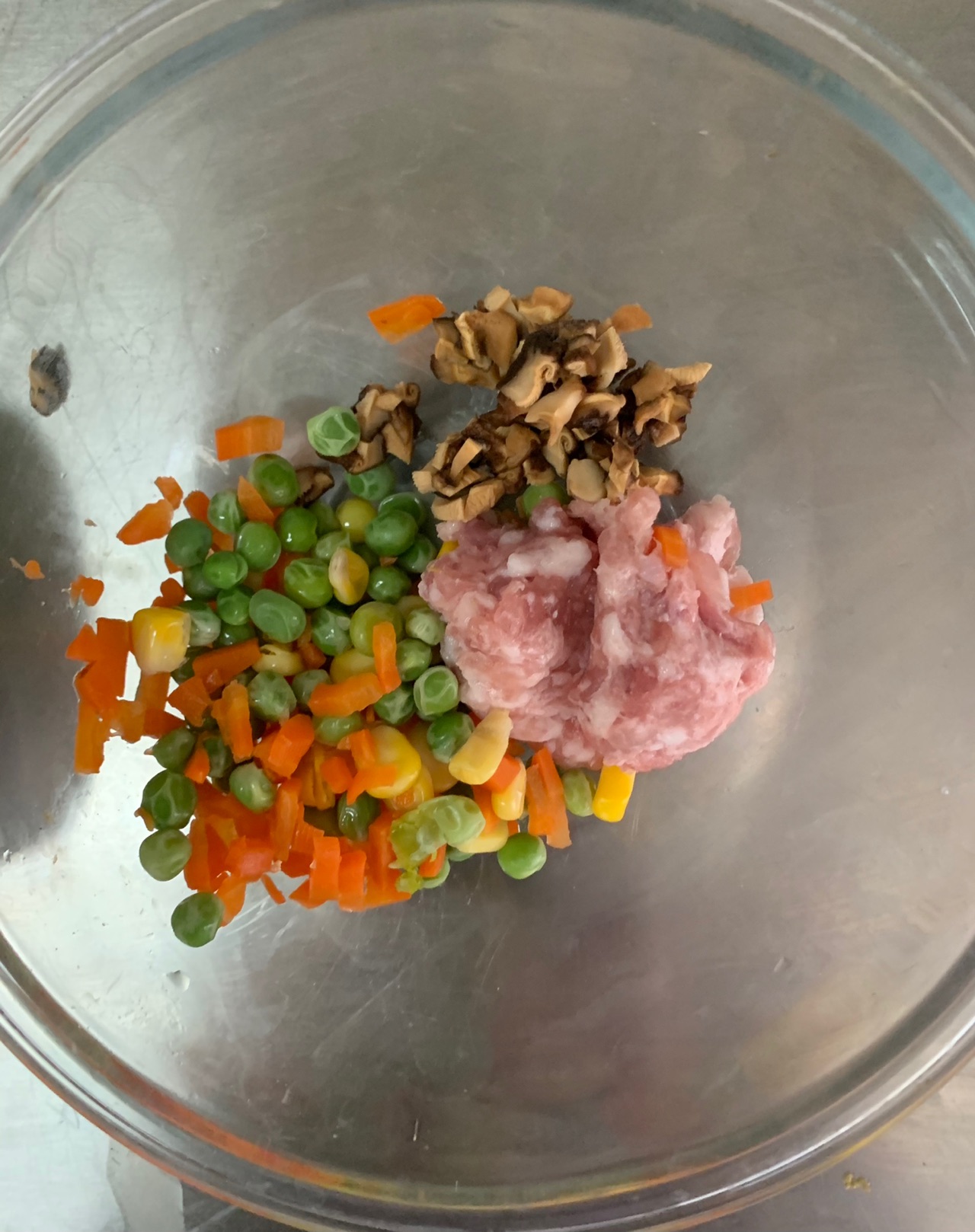 步骤5、内馅:肉馅、豌豆、胡萝卜丁、香菇丁。