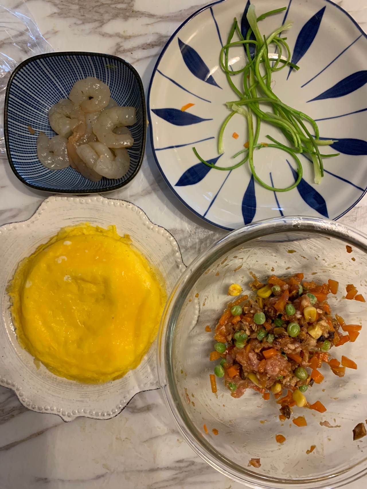 辅料:虾仁6个、肉馅少许、香菇1朵、胡萝卜丁少许、豌豆玉米粒少许、蚝油1勺、生抽1勺、盐1克