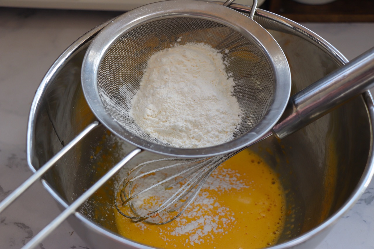 步骤5、将蛋黄糊加入到打发的蛋白中翻拌均匀