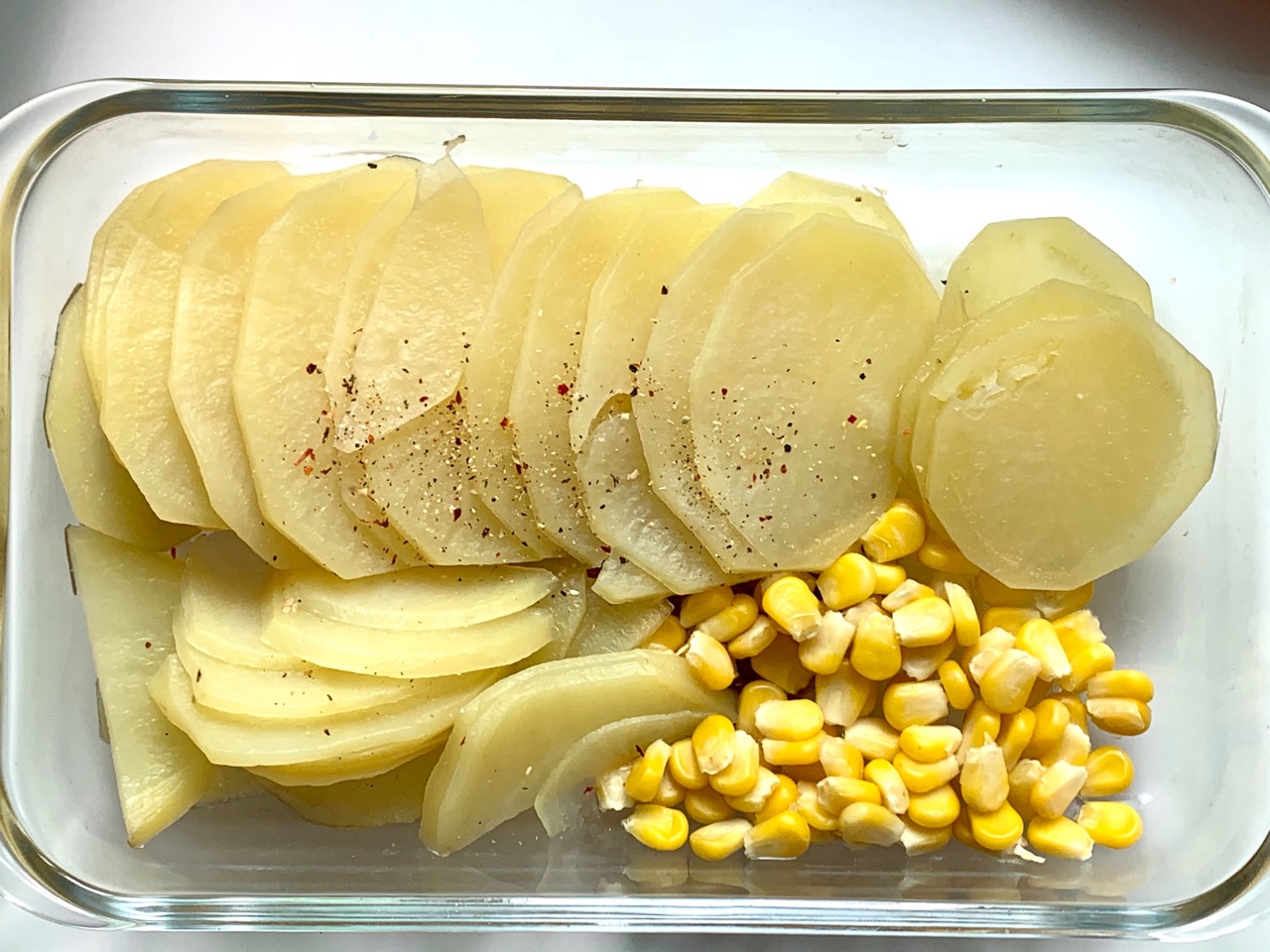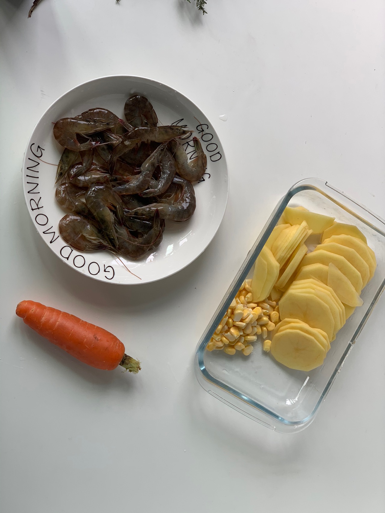 步骤1、食材准备,土豆去皮切片,玉米粒洗干净