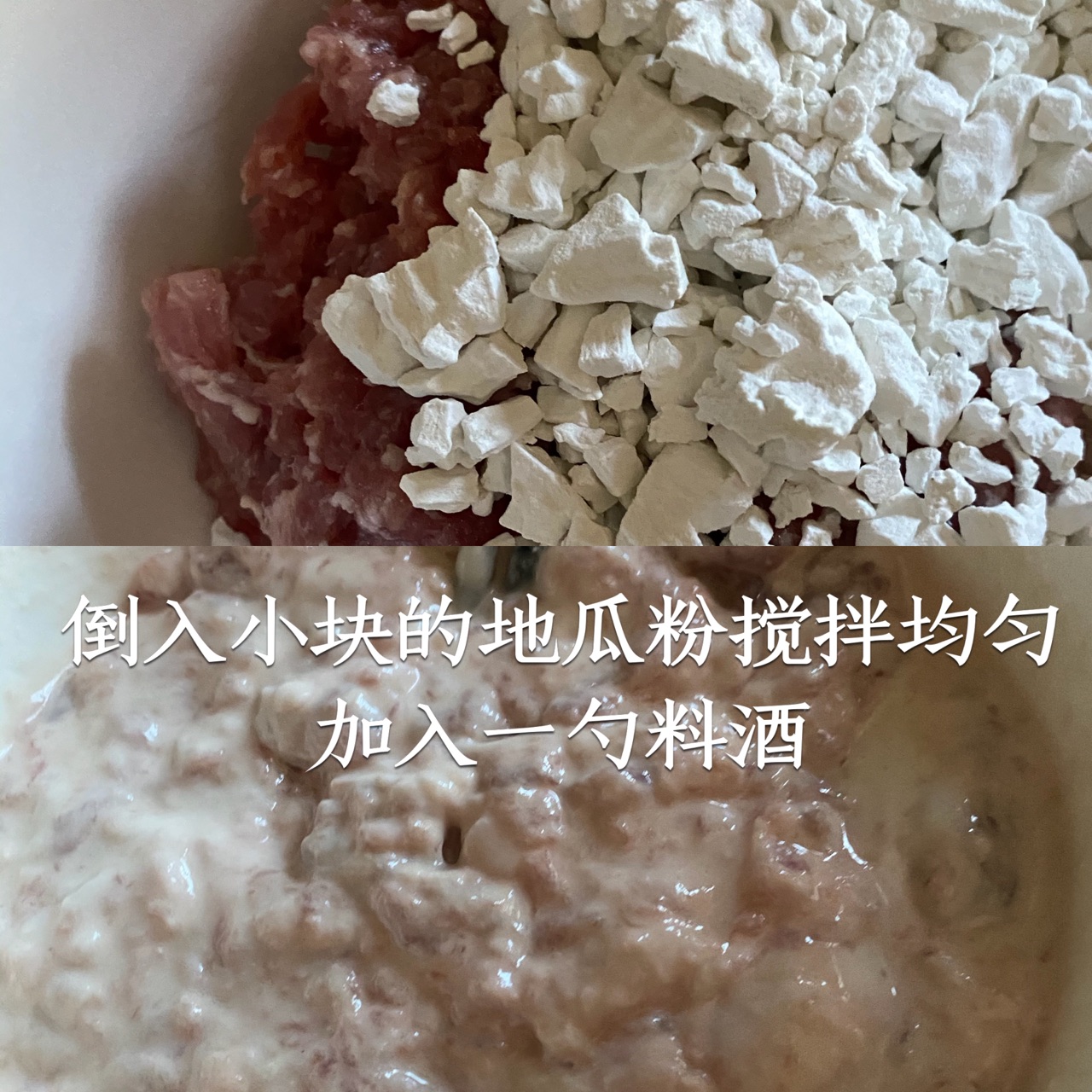 步骤3、倒入小块的地瓜粉搅拌均匀加入一勺料酒