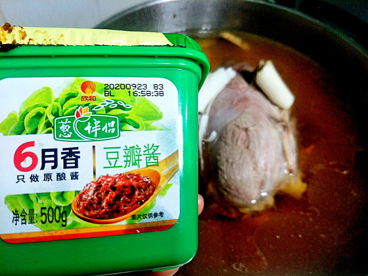 步骤7、加入欣和葱伴侣原味黄豆酱。开大火煮开后换小火慢煮60分钟左右。