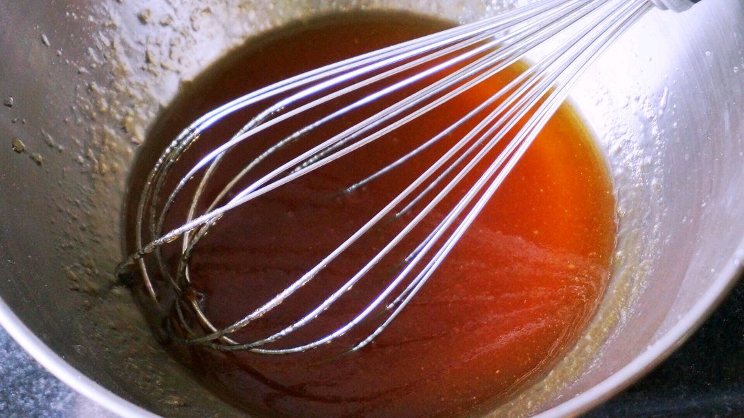 步骤6、糖浆,枧水,花生油充分搅拌均匀,乳化至融为一体,没有花生油也可以换别的植物油