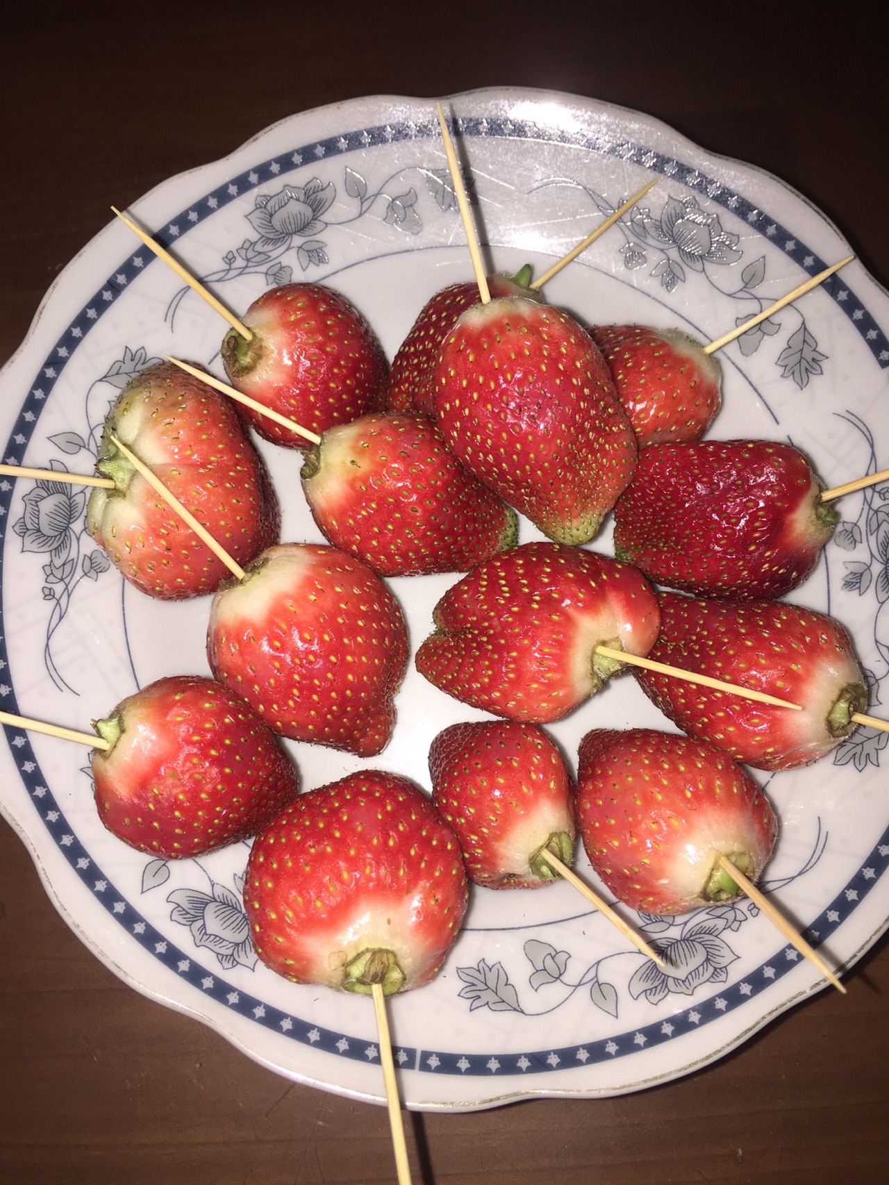 步骤1、准备好清洗干净的草莓,用厨房纸巾吸干多余的水份,用牙签或竹签串好。放一旁待用。