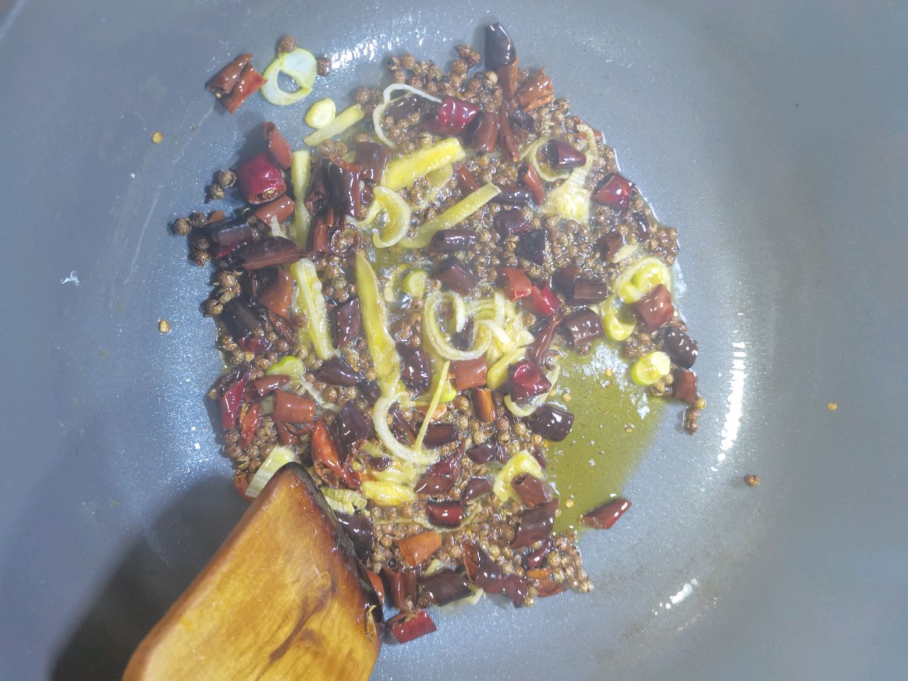 辅料:麻椒粒适量、干红辣椒适量、姜几片、酱油2勺、油适量、盐鸡精适量