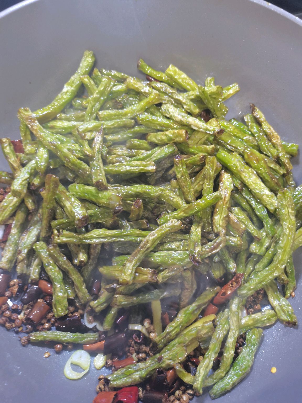 步骤8、下入刚才备用的豆角。加点海鲜酱油。盐。鸡精,翻炒均匀。