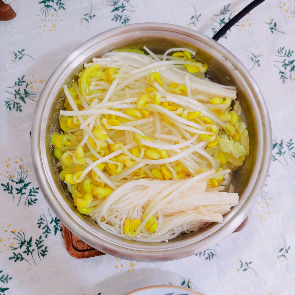 步骤2、锅里放水,水开放入菜金针菇还有豆芽,捞水二分钟捞出备用。