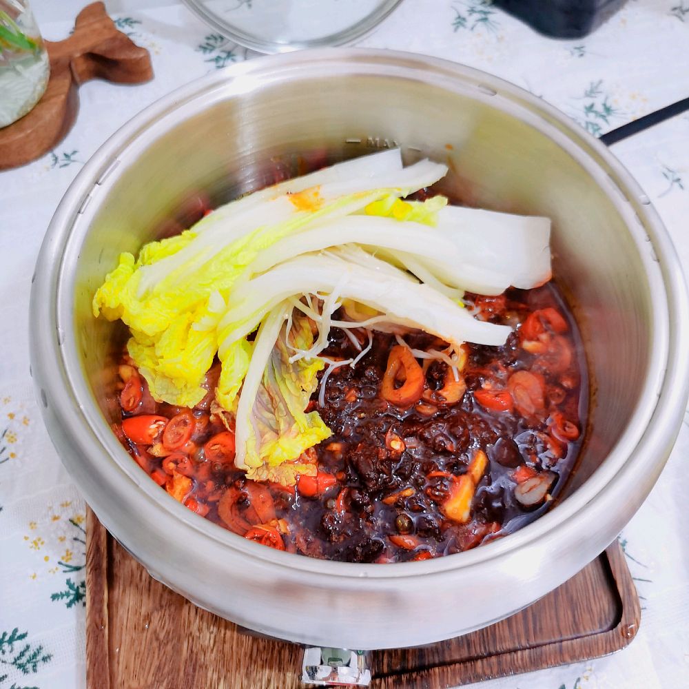 辅料:花蛤200g、娃娃菜1个、豆芽100g、金针菇150g、大蒜小米辣少许、干锅酱30g