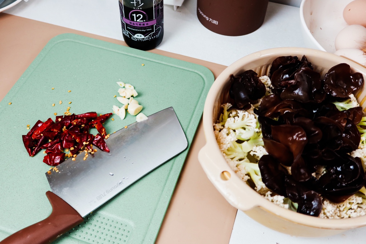 辅料:木耳50克、干辣椒适量、大蒜适量、生抽1勺