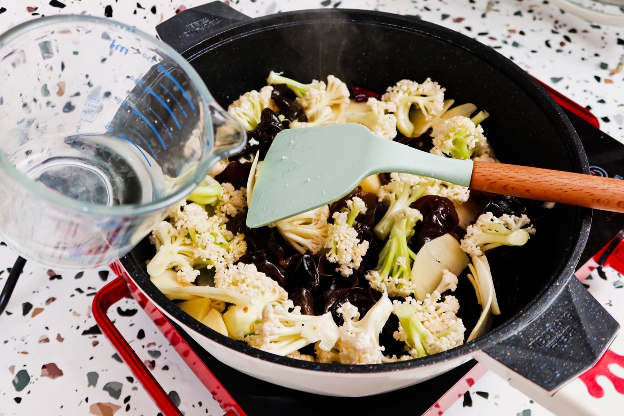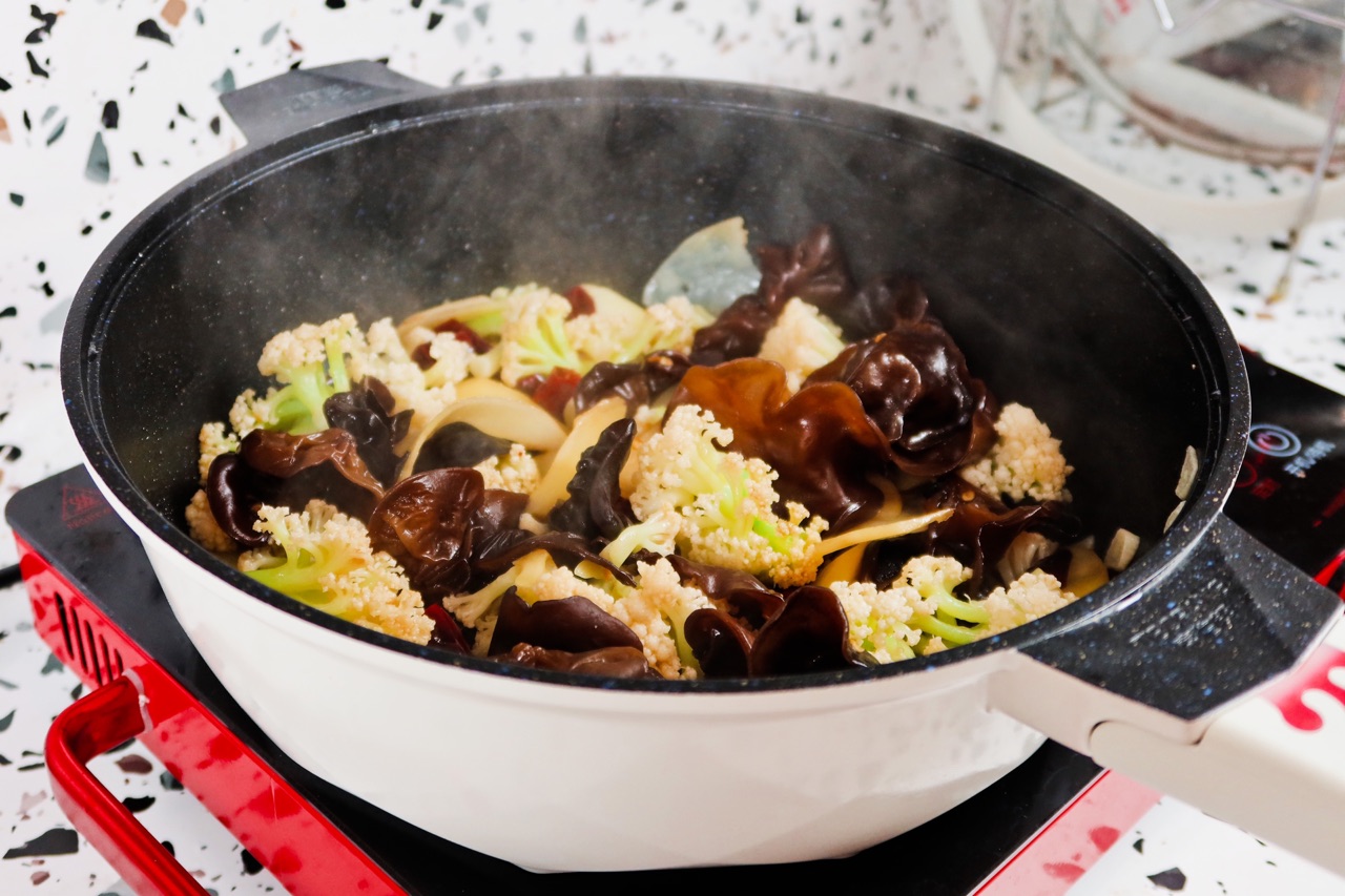 步骤3、煸香后倒入土豆,花椰菜和木耳。