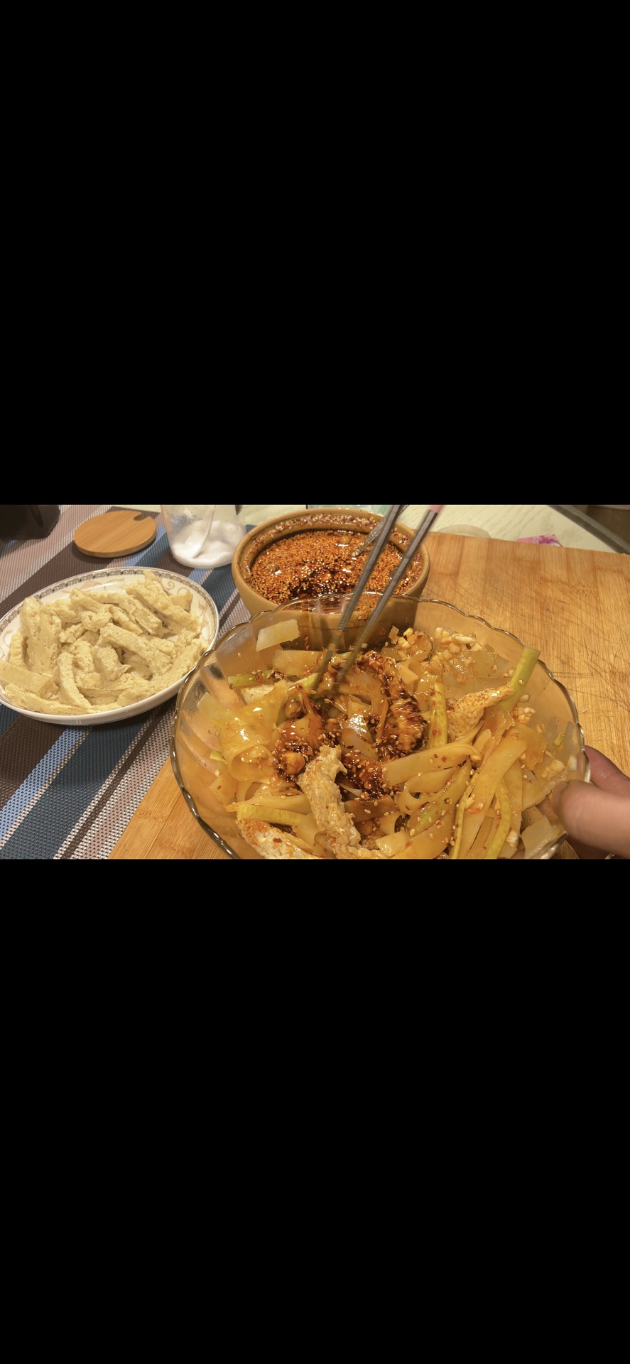 步骤23、放入面筋,黄瓜丝,酱油醋,辣椒